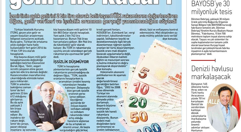 No Comments  Türkiye İstatistik Kurumu (TÜİK), geçen yılın gelir ve yaşam koşulları araştırması bölgesel sonuçlarını açıkladı. Buna göre, Türkiye’de ortalama yıllık eşdeğer hane halkı kullanılabilir fert geliri 2016’da 19 bin 139 lira olarak hesaplandı. RAKAMLAR GERÇEK DIŞI Kişi başına düşen milli gelir hesaplamasında değişikliğe gidildiğini belirten Ekonomist Burak Oğuz, “Gelir, asgari ücretli çalışanın eline geçen aylık bin