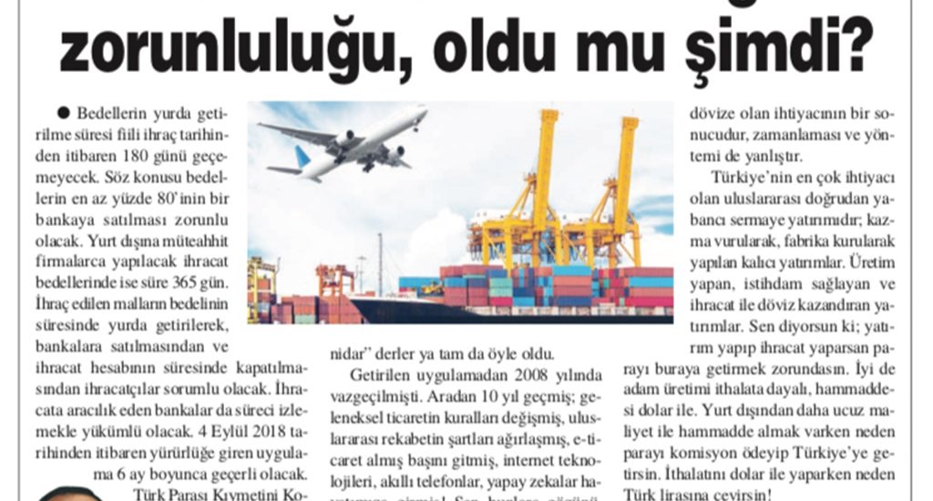 (Turkish) İhracat bedellerinin 180 gün içinde Türkiye’ye getirilmesine zorunluluk geldi.